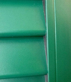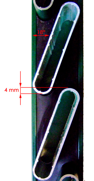 Particolare dell'ovalina da 50 mm inserita nella persiana con inclinazione di 18°. Si nota anche il considerevole spessore delle ovaline, mollto resistenti agli agenti atmosferici che potrebbero verificarsi nel tempo. |
