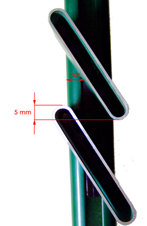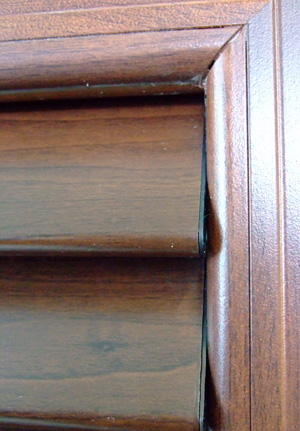 Particolare dell'ovalina da 65 mm inserita nella persiana con inclinazione di 30°. Si nota anche il considerevole spessore delle ovaline, mollto resistenti agli agenti atmosferici che potrebbero verificarsi nel tempo.