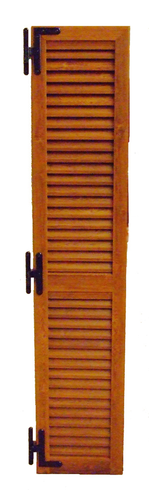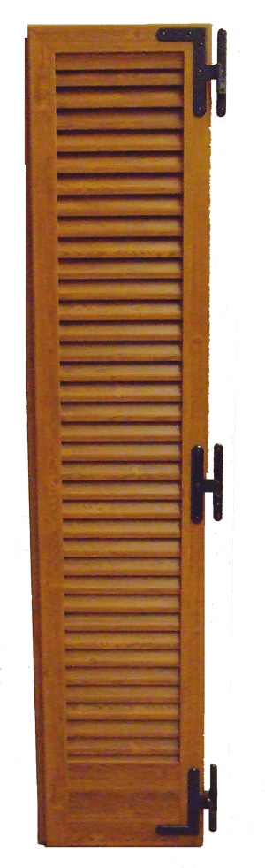 Gelosia con paletta fissa sagomata senza fascia centrale, zoccolo maggiorato H=320 mm, accessori in alluminio e chiusura a spagnoletta.