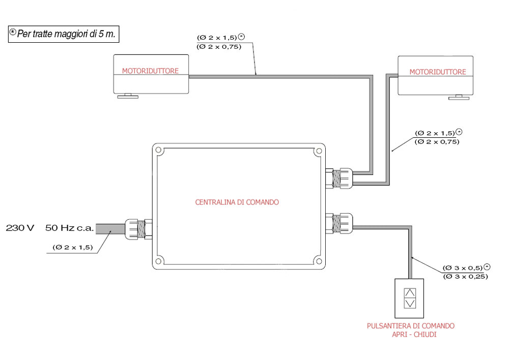 Dalla pulsantiera di comando devono essere posti tre fili dal diametro di 0,25 mm (per una tratta inferiore ai 5 metri) che arriveranno fino alla centralina di comando, posta tra i due motoriduttori. I tre fili servono esattamente ad i comandi di apertura, chiusura e comune. (spiegazioni più dettagliate per il collegamento verrano date nelle istruzioni allegate al meccanismo)